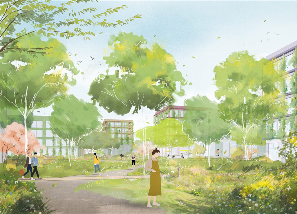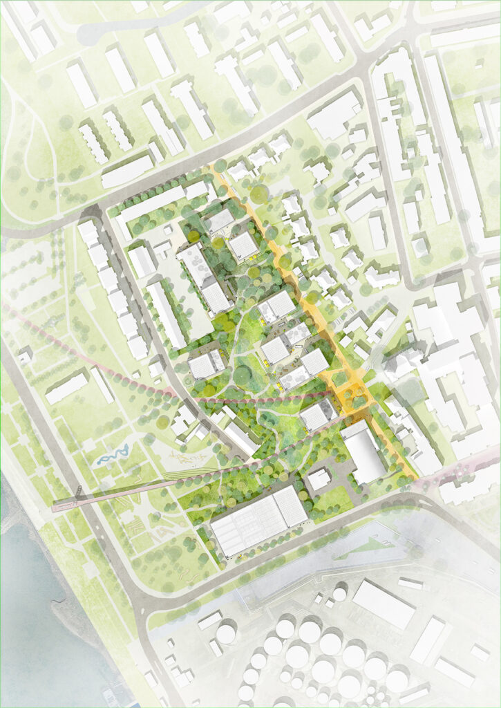 Städtebaulich freiraumplanerischer Wettbewerb nach RPW 2013 „Businessquartier Niederfeldstraße“ in Leverkusen Wiesdorf (1. Preis), 2025, Grüner Campus direkt am Rhein mit Büro- und Forschungsflächen, einer Bunkeraufstockung, Wohndienst, Quartiersgarage und einer Stadtteilhalle. Fläche ca. 3 ha, GF: ca. 30.000 qm. In Zusammenarbeit mit Treibhaus Landschaftsarchitektur. Auftraggeberin: Leverkusener Immobiliengesellschaft mbH (LEVI), Tochtergesellschaft der Stadt Leverkusen.